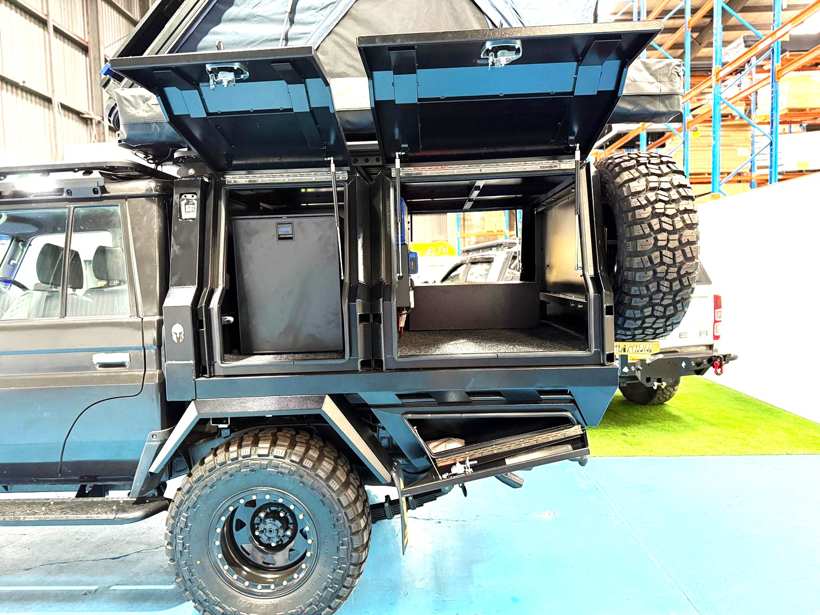 FEATURES: TWIN GAS STRUT ASSISTED DOORS / WHALE TAIL LOCKS/ STAINLESS STEEL PIANO HINGES / 2.5MM ALUMINIUM FLAT PLATE/ REINFORCING BRACING SYSTEM/ JACK OFF COMPATIBLES/ / REINFORCED SUB FLOOR.